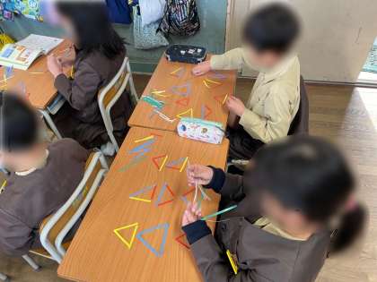 3年生は、算数で三角形の学習をしました。様々な三角形の中から共通点を見つけ、三つのグループに分けました。辺の長さに着目し、正三角形や二等辺三角形といった三角形があることを知りました。