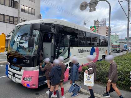 6年生は、万博に向けて実用化が進められている「空飛ぶクルマ」の実証実験の見学に来ました。今日は、空飛ぶクルマの代わりにヘリコプターを飛ばして、実験を行うところを見せてもらいます。
