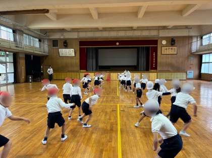 1年生は体育の学習で「鬼遊び」をしています。今日は「ねことねずみ」という遊びです。ねこ、ねずみの2つのチームに分かれて先生に呼ばれた方が逃げます。「ねこ」か「ねずみ」、どちらが呼ばれるか、子ども達はドキドキしながら先生の言葉を聞いていました。