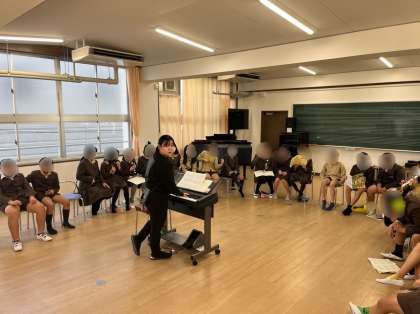 5年生は音楽の学習です。リコーダーでシンコペイテッド・クロックという曲の演奏を練習しています。先生が弾くピアノの音を聞いて、どこにリズムのアクセントがあるかを確かめた後、リコーダー練習しました。