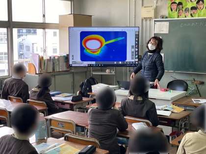 4年生は理科の学習です。金属や水、空気はどのようにあたたまるのかについて実験してきます。今日は、フライパンが温まる様子をサーモグラフィの映像から調べていきました。