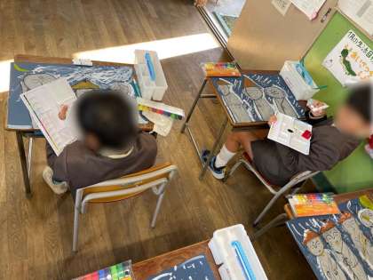 1年生は、国語の学習でした。いろいろなことばを集めて文をつくります。教科書の挿絵に合うことばを選んで、さまざまな文を楽しみながら考えました。