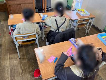 1年生は学級活動で卒業する6年生にメッセージカードを書いています。1年間お世話になった6年生に気持ちを込めたメッセージカードができあがりました。
