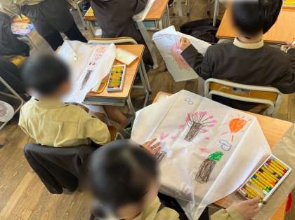 1年生は生活科の学習で凧づくりをしています。凧にサインペンを使って好きな絵を描いていきました。自分の描いた凧が上がるのが楽しみですね。