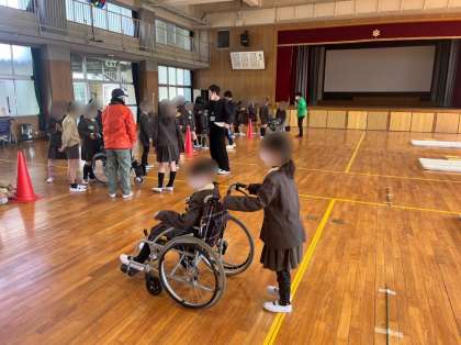 4年生は此花区社会福協議会の方の協力のもと、車いす体験をしました。実際に車いすに座ったり、押したりして体験することを通じて、車いすを利用する方はどんなことで困っているか、また、車いすを押す立場ではどんなことに気をつけなければいけないかわかりました。