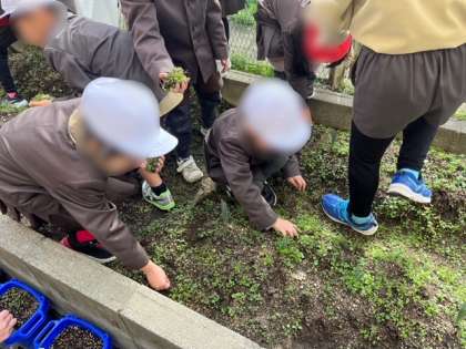 1年生は生活科の学習で、チューリップの観察をしています。少しずつ芽が出て伸びてきました。どんな色の花が咲くか楽しみですね。観察の後は、学習園の雑草ぬきをしました。