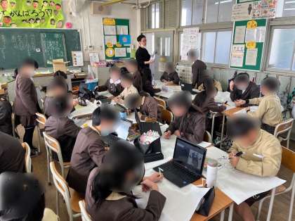 4年生は図工の学習です。4年生1年間で制作した作品を入れる作品袋に絵付けをしました。学習端末でお手本を探しながら一人一人オリジナルの作品袋に仕上げました。