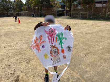 1年生は生活科の学習で凧あげをしました。児童それぞれが自由に絵付けした凧を持って校外グランドに行きました。今日は、適度に風が吹いていて凧あげ日和です。いざ糸を伸ばして、元気にグランドを駆けると、凧が風に乗って高く上がりました。とても楽しい体験になりました。