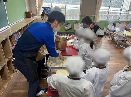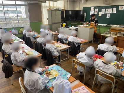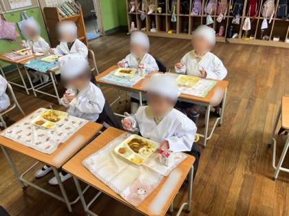 今日から給食が始まります。今日は、入学お祝い献立ということで、カツカレーとフルーツゼリーです。1年生は、とてもおいしそうに給食を食べていました。たくさん食べてくださいね!