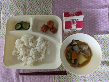 まぐろのオーロラ煮、豚肉と野菜の煮もの、きゅうりの赤じそあえ、ごはん、牛乳