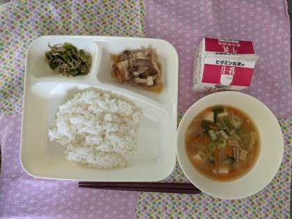 豚肉のしょうが焼き、とうふのみそ汁、じゃこピーマン、ごはん、牛乳