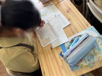 5年生は理科の学習です。アブラナの花のつくりについて、虫めがねをつかって、花が咲いた後の実はどのようにできるか調べました。調べてみると、めしべが大きくなって実になることがわかりました。