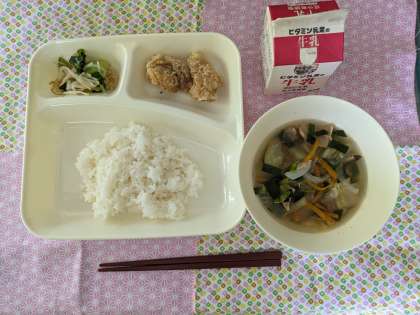 鶏肉のからあげ、中華スープ、チンゲンサイともやしの甘酢あえ、ごはん、牛乳