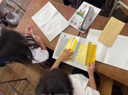 5年生は算数の学習です。これまで直方体や立方体の体積について学習してきました。今日は、グループになって練習問題に取り組み、答え合わせをしました。グループで集中して取り組んでいて立派です。