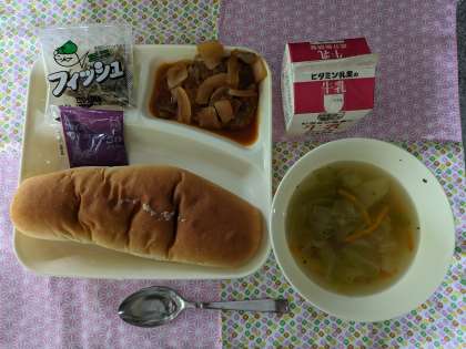 煮こみハンバーグ、野菜スープ、ミニフィッシュ、コッペパン、ブルーベリージャム、牛乳