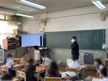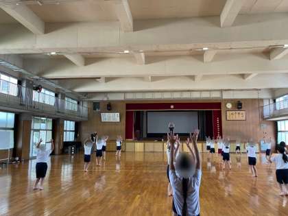 5年生は講堂で、運動会の団体演技の練習に取り組んでいました。子どもたちは、一つひとつの動作を確かめながら、演技を覚えていきます。本番では自信をもって演技ができるように練習していこうね。