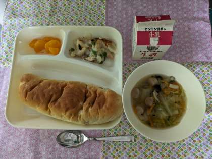 マカロニグラタン、キャベツのスープ、みかん(缶)、おさつパン、牛乳