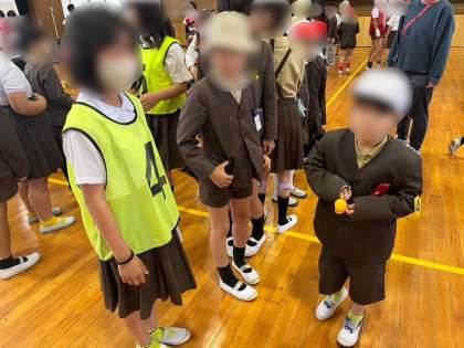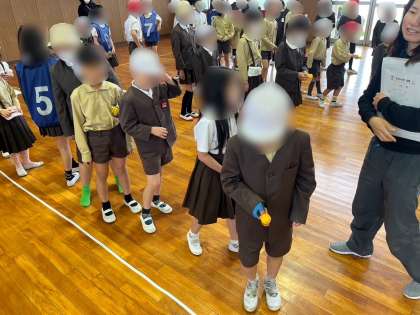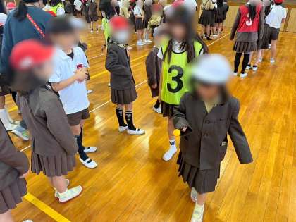今日の児童集会は、玉運びリレーです。スプーンにのせたピンポン玉を交代で運ぶ速さを競いました。高学年の児童は、そっと低学年の児童に玉を渡していました。玉を受け取った児童は、落とさないように注意しながら上手に運ぶことができました。