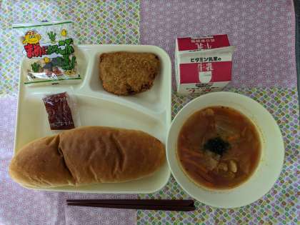 一口トンカツ、ミネストローネ、豆こんぶ、コッペパン、いちごジャム、牛乳