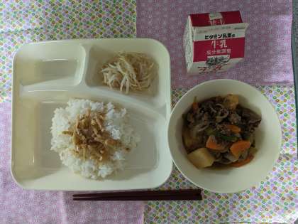 みそ肉じゃが、もやしの甘酢あえ、ごまかかいため、ご飯、牛乳