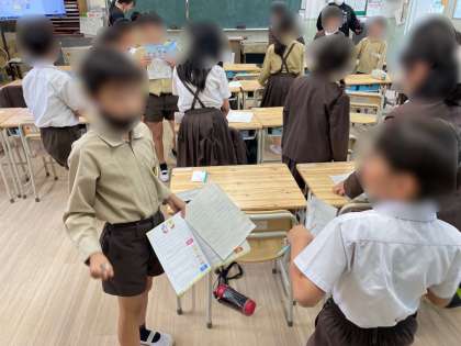 4年生は、外国語活動でした。教室の中を自由に歩いて、出会った人と「Rock、Scissiors、 Paper、1・2・3」でじゃんけんをし、自己紹介をしました。