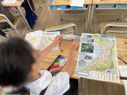 4年生は、社会でした。これまでの学習のまとめとして、大阪府を紹介するカードをつくります。山地や海、川といった地形の特徴や産業など、自分が興味をもった内容についてどのようにまとめるか考えました。