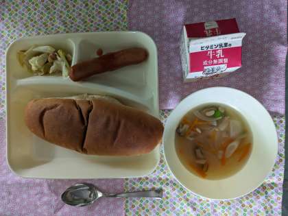 ウインナーのケチャップソース、スープ、焼きツナキャベツ、黒糖パン、牛乳