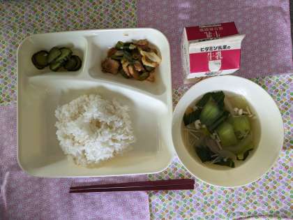 ホイコウロー、中華スープ、きゅうりのピリ辛あえ、ご飯、牛乳