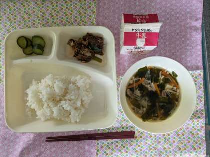 プルコギ、とうふとわかめのスープ、きゅうりの甘酢づけ、ごはん、牛乳