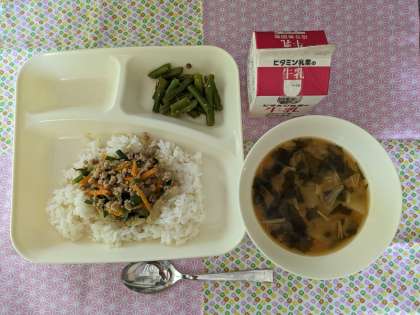 豚ひき肉とにらのそぼろ丼、じゃがいものみそ汁、さんどまめのごまあえ、ごはん、牛乳
