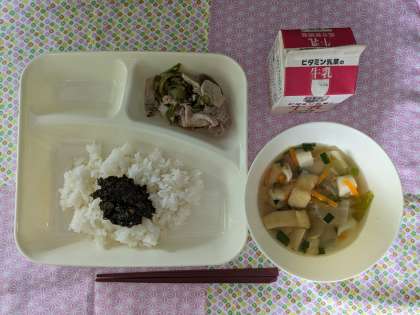 豚肉の梅風味焼き、五目汁、のりのつくだ煮、ごはん、牛乳