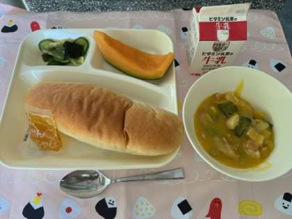 鶏肉とかぼちゃのシチュー、ミックス海そうのサラダ、クインシーメロン、コッペパン、みかんジャム、牛乳