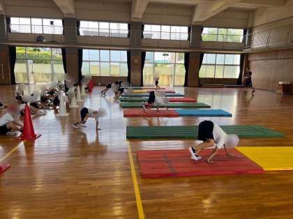 2年生は体育でマット運動をしています。四つん這いになり、動物になって動きました。それぞれが上手に動物になりきって運動することができました。