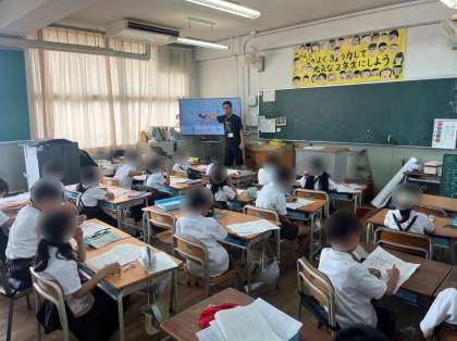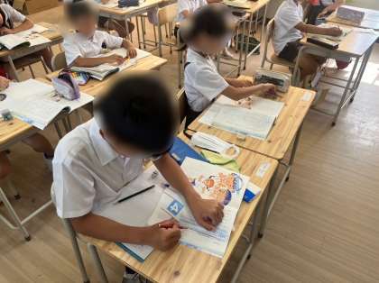 5年生は外国語の学習です。英語で今日の曜日や時間割の表現の仕方を学習しました。先生の問いかけに合う答えをイラストから選んで英語で発音しました。