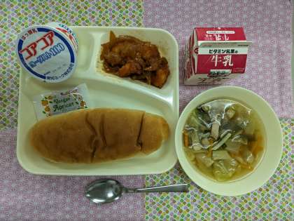 えびのチリソース、中華スープ、ヨーグルト、コッペパン、アプリコットジャム、牛乳