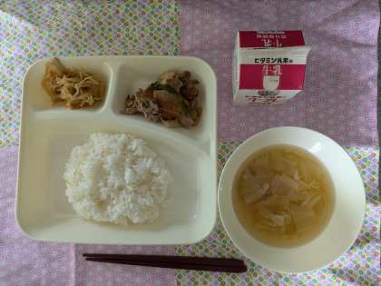豚肉のごまみそ焼き、すまし汁、切り干しだいこんのいため煮、ごはん、牛乳
