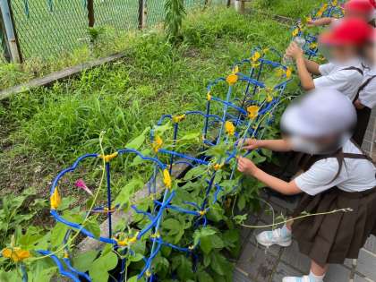 朝会後には、1年生の子どもたちが、アサガオに水やりをしていました。「一杯お花を咲かせてね。」花が少しずつ咲きだして、みんな嬉しそうです。