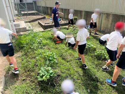 2年生は生活科の学習で学習園に来ています。6月に入りたくさん雨が降ったせいで学習園は雑草だらけです。サツマイモとミニトマトがよく育つように、みんなで協力して雑草ぬきをしました。