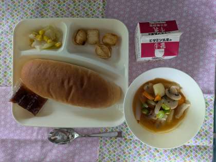 いかてんぷら、フレッシュトマトのスープ煮、キャベツとコーンのサラダ、コッペパン、いちごジャム、牛乳