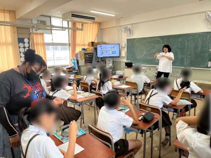 6年生は外国語の学習です。"What time do you get up?"を使って一日の生活の家でしている手伝いについてたずね合いました。