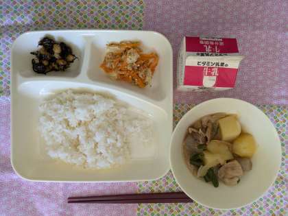 豚肉とじゃがいもの煮もの、ひじき豆、ささみと野菜のごまみそ焼き、ごはん、牛乳