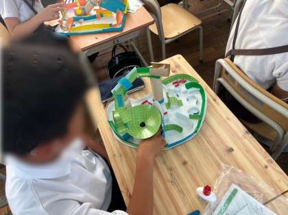 5年生は図工の学習で「ビー玉大冒険」という作品制作に取り組んでいます。ビー玉が転がる道筋を考えて、そのコースを接着していきます。とても素敵な作品が仕上がっていました。