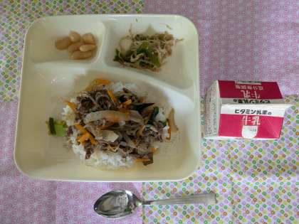 牛丼、もやしとピーマンのごまいため、大福豆の煮もの、牛乳