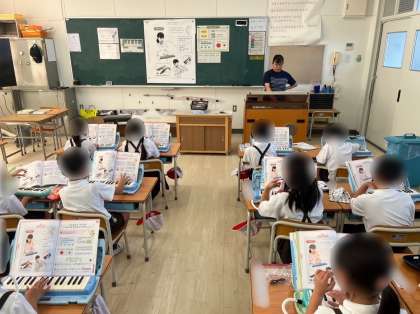 1年生は音楽の学習です。鍵盤ハーモニカでいろいろな音を見つけることにチャレンジしました。一つの音、いくつかの音、白い、黒い鍵盤、高い、低い音など色々な音を見つけました。