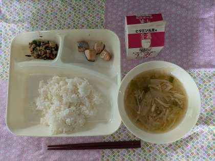 さけのつけ焼き、五目汁、高野どうふのいり煮、ごはん、牛乳
