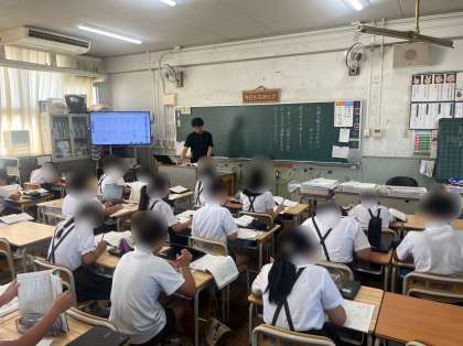 4年生は理科で「月の位置」について学習をしています。月の方向を確認するため、実際に教室の前に立って位置関係を確認しました。また、月の位置は建物を目印にして調べるとわかりやすいことにも気づきました。