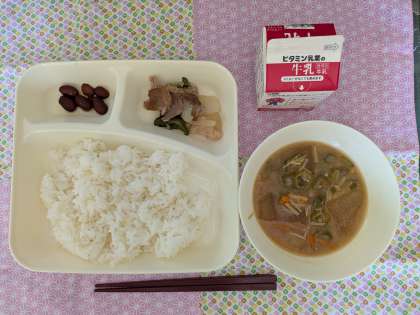 給食の金時豆の煮ものは、給食室で1時間以上かけてコトコト煮ています。煮豆は苦手な人が多いですが、栄養豊富なので食べてほしいです。