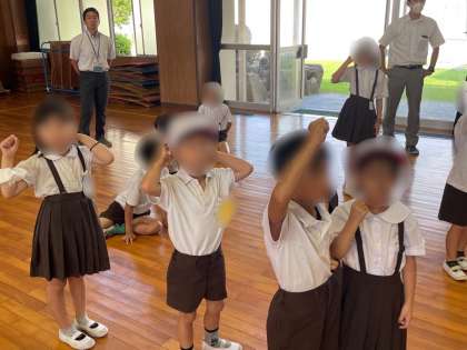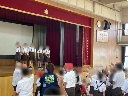 2学期最初の児童集会は、集会委員会による「じゃんけんゲーム」でした。ルールはシンプルに前に立った集会委員会の児童とじゃんけんをし、負ければ座るというものです。シンプルなゲームですが、大変盛り上がりました。