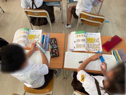 1年生は、算数でした。「10よりおおきいかず」の学習の導入で、教科書に載っているどんぐりの数を数えました。算数ブロックを使い、10といくつかに分けて並べて考えました。