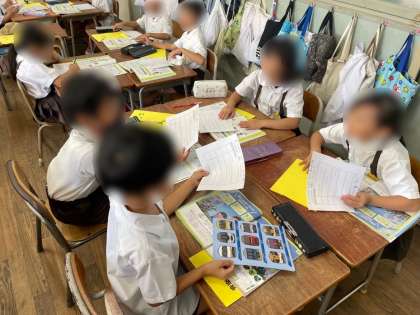 2年生は、音楽でした。生き物の鳴き声を声で表し、音楽を作ります。声の高さや強さ、出し方を工夫し、どのように鳴き声を組み合わせたらいいかをグループで話し合いました。